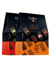 12 Pocketbag de 18 mini-tablettes 8g assortiment GALLER Noir Lait Blanc ou assortiment Noir.